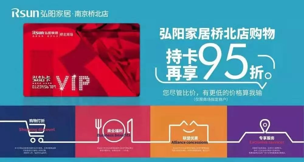 与此同时,弘阳家居还以桥北店为试点,推出了95折的“特权卡”——“弘钻卡”。除了所有家居产品同质同品同价基础上的折扣以及满赠活动之外,还与诸多品牌强强联手,消费者可以凭此卡享受儿童教育培训优惠、弘阳广场餐饮折扣、影院小食赠送等诸多服务。在让利消费者的同时,也增加了家居项目与购物中心项目之间的联动。