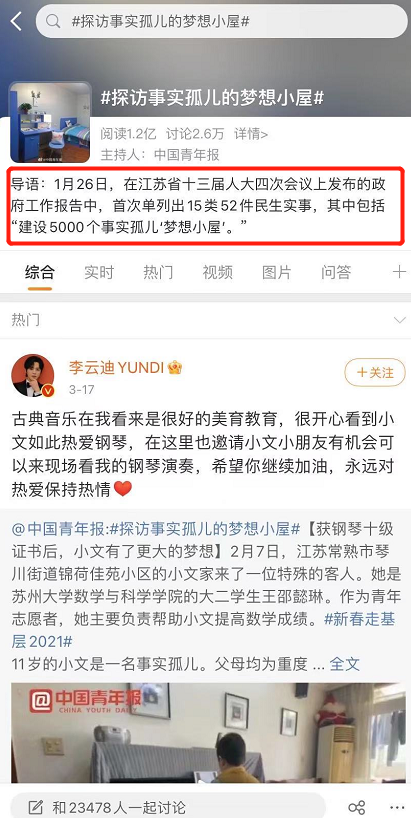 微博上,#探访事实孤儿的梦想小屋#话题