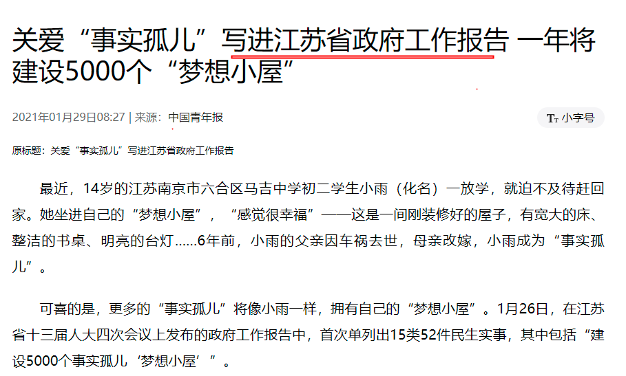 2020年12月,共青团江苏省委、江苏省扶贫办、江苏省青年联合会、江苏省青少年发展基金会共同发起“梦想改造+”关爱计划,以全省6-16岁事实孤儿为主体,提供精准链式、持续贴心服务。