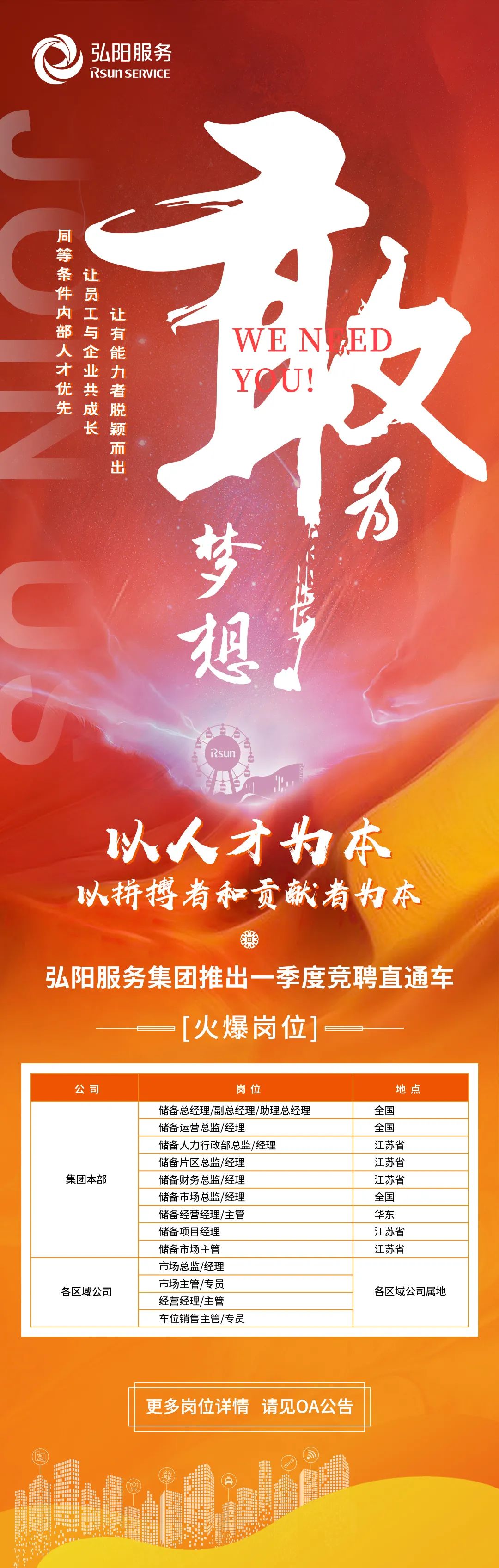 弘阳一直秉持着人才驱动企业成长的理念,一直为员工拓宽职业发展通道,提供公平、公正、公开自我展示的内部竞聘机会。2021年是弘阳服务集团新三年战略的首年,我们致力打造体系化人才培养与输出机制,匹配差异化激励机制,从而打造以人才为本,以拼搏者和贡献者为本的自驱动、自成长组织。此次弘阳服务集团一季度竞聘,共计推出110个岗位,鼓励更多的小伙伴跨区域跨专业内部竞聘,充分展示自我才华。